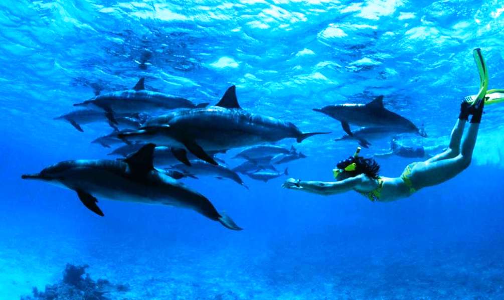 The species frequently found at bay are of spinner and bottlenose dolphins’ type. You will swim with dolphins if they stay close by to the boat (Not guaranteed to swim with them ), but is unlikely to be able to touch the dolphins as they are of course wild animals. You will then go on to one of the selected snorkeling locations. Here you will snorkel while accompanied by a snorkeling guide to show points of interest and to assist with beginners. Snorkeling equipment will be provided on hire throughout .